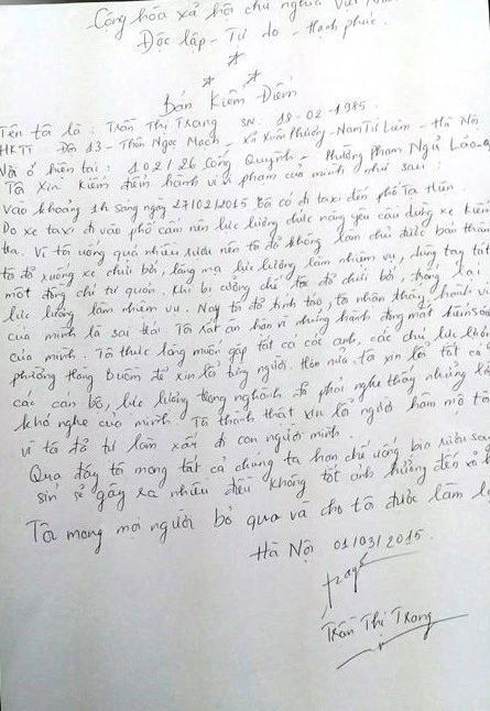 Tại cơ quan công an, Trang Trần đã viết bản kiểm điểm, xin lỗi lực lượng chức năng với nội dung: “Vì uống quá nhiều rượu nên tôi đã không làm chủ được bản thân. Tôi đã xuống xe chửi bới, lăng mạ lực lượng làm nhiệm vụ, dùng tay tát một đồng chí tự quản. Khi bị cưỡng chế tôi đã chửi bới, chống lại lực lượng làm nhiệm vụ. Nay tôi đã tỉnh táo, tôi nhận thấy hành vi của mình là sai trái. Tôi rất ân hận vì những hành động mất kiểm soát của mình.