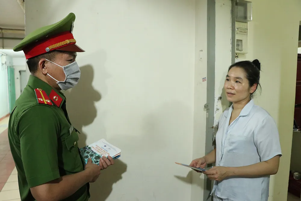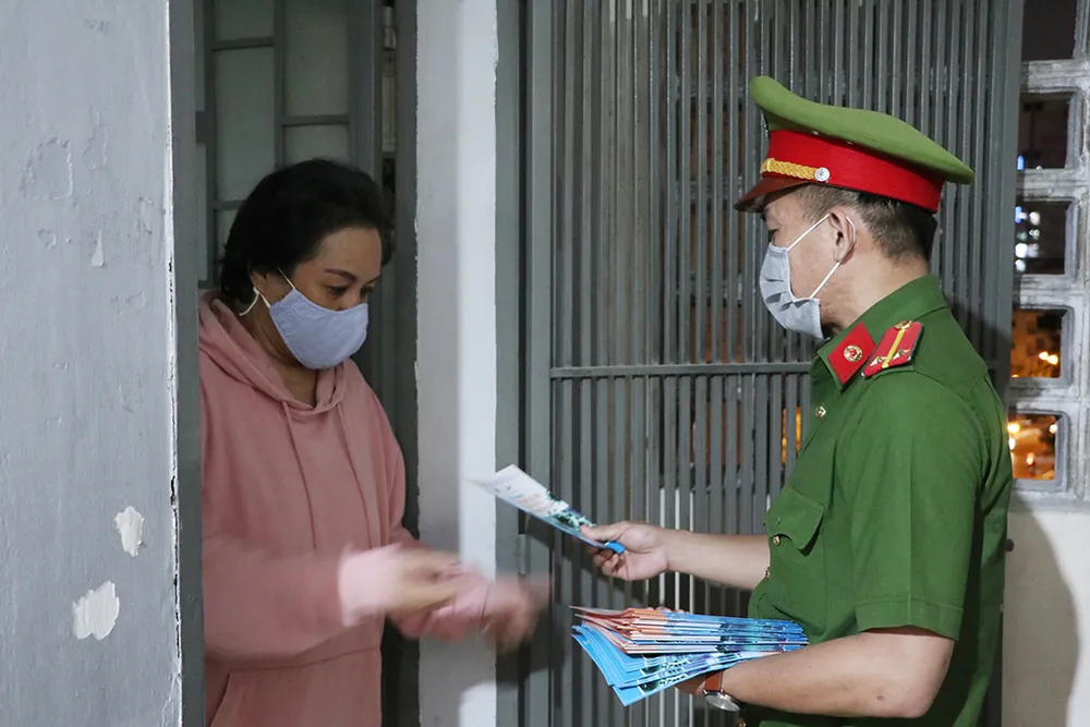 Tổ công tác sau đó gõ cửa nhiều hộ gia đình ở Block C. Cán bộ công an khu vực phụ trách trực tiếp gặp các chủ hộ để phát cẩm nang phòng tránh dịch bệnh COVID-19 và khuyến cáo người dân hạn chế xuất hiện ở khu vực đông người; đi thang máy cần rửa tay và đeo khẩu trang để tránh lây lan mầm bệnh.