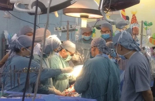 Các bác sĩ đang cấp cứu cho bé trai bị vật nhọn đâm thủng tim. Ảnh: CTV