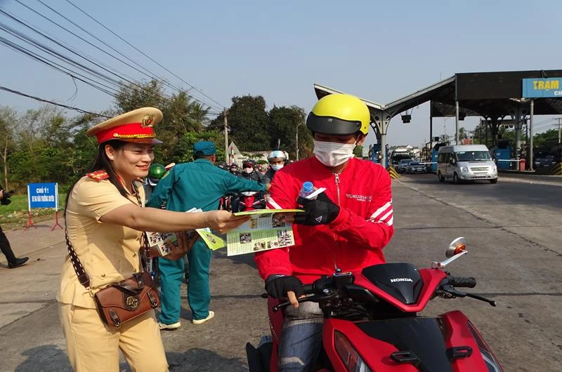 Nữ CSGT phát tờ rơi tuyên truyền cho người tham gia giao thông đúng luật.