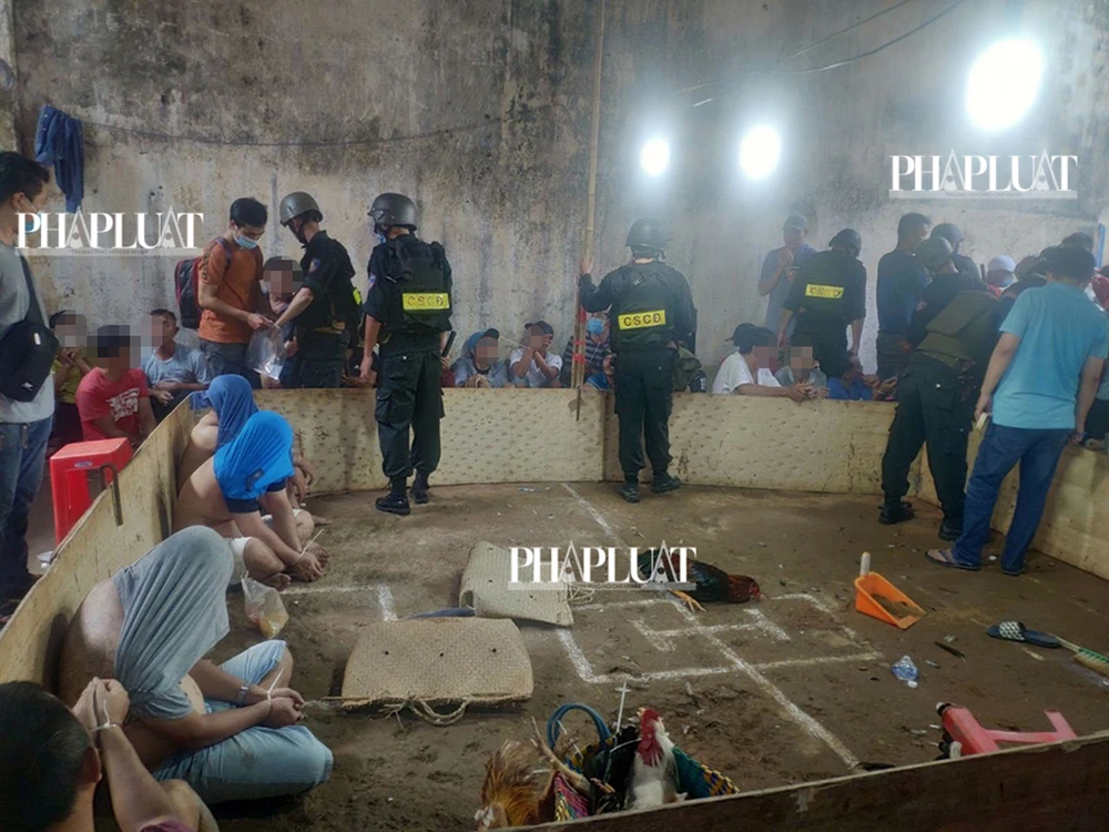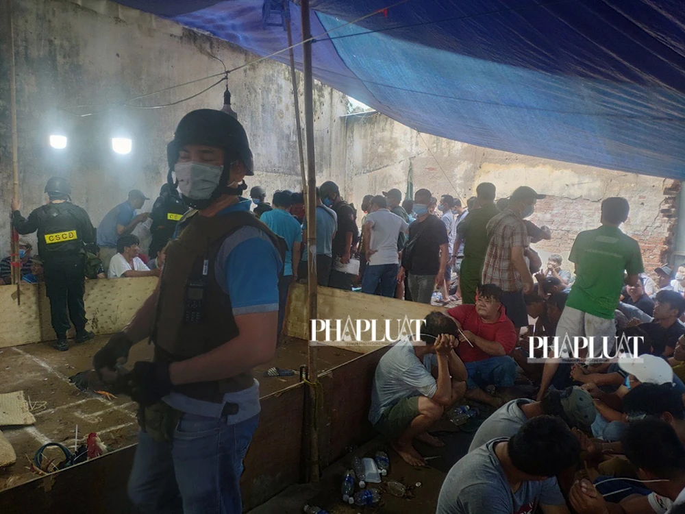 Theo đó, chiều cùng ngày, hàng trăm cảnh sát ập vào bãi đất rộng hàng trăm mét vuông phát hiện gần 200 người đang sát phạt bằng hình thức đá gà ăn tiền.