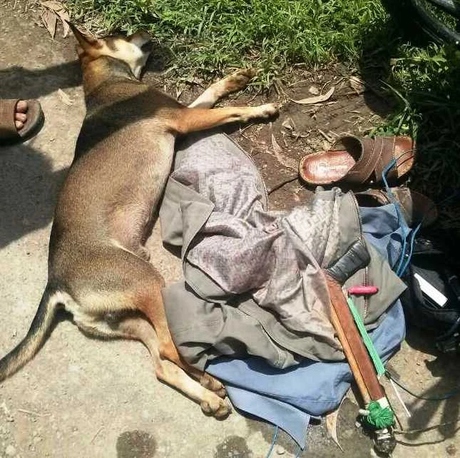 Thấy vậy, hàng trăm người dân đã bao vây khu vực vườn cây để truy tìm hai “cẩu tặc”. Sau 40 phút tìm kiếm, hai cán bộ công an cùng người dân phát hiện hai “cẩu tặc” đang lặn dưới mương nước nên tiến hành bắt giữ. Tang vật là súng kích điện tự chế, bình ắc quy, túi nilon đựng ớt bột, bả chó, dao găm và một con chó nặng gần 15kg đã chết.