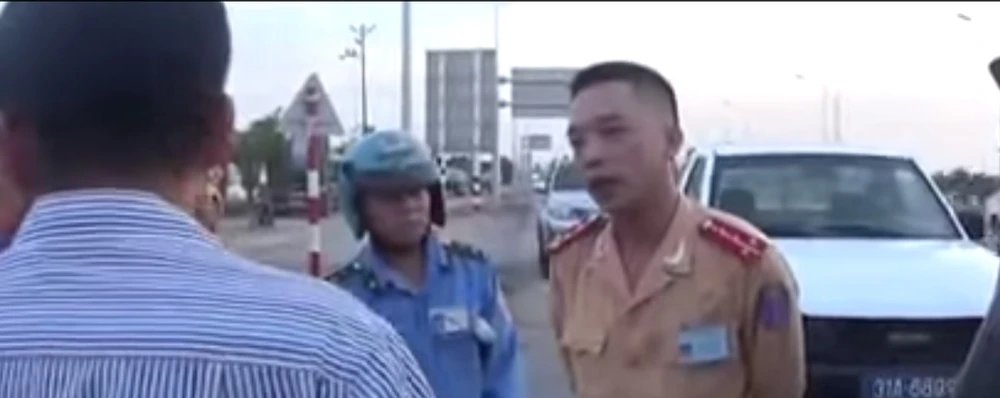 Một CSGT thuộc tổ công tác Trạm Cảnh sát giao thông Quán Trữ đang giải quyết việc với ông Nguyễn Xuân Lịch - Chi cục trưởng Chi cục Quản lý đường bộ I.7 (ảnh cắt từ clip)