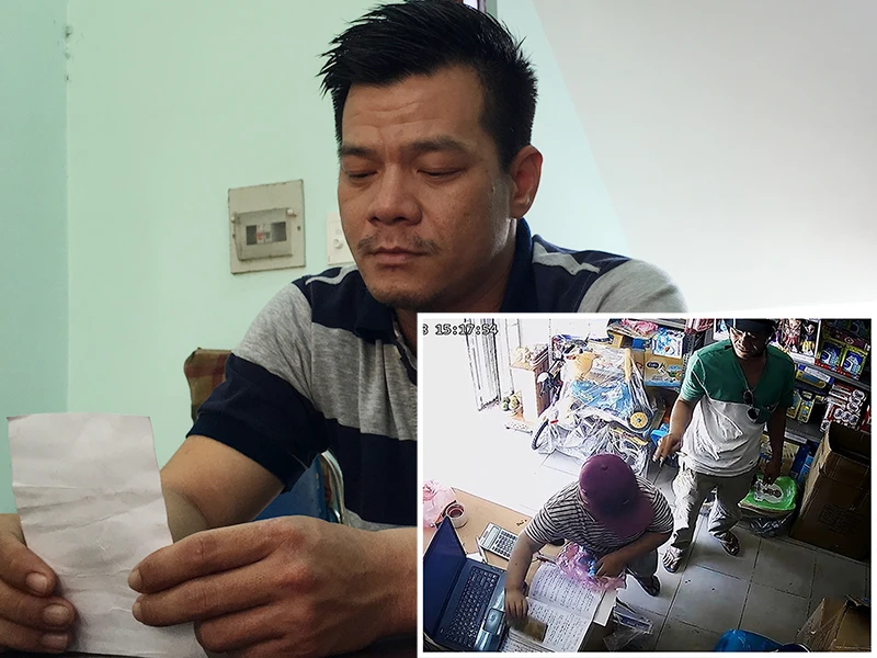 Sơn cầm tấm hình của con trai tại cơ quan điều tra. Ảnh: HT. Hình ảnh từ camera an ninh cho thấy người cha dẫn con đi ăn trộm. (Ảnh cắt từ clip)