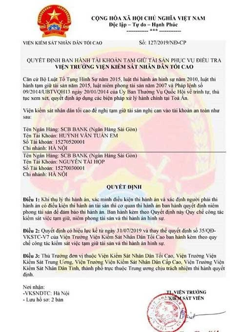 Văn bản giả mạo quyết định của VKSND Tối cao mà nhóm lừa đảo gửi cho nạn nhân. (Ảnh do công an cung cấp)