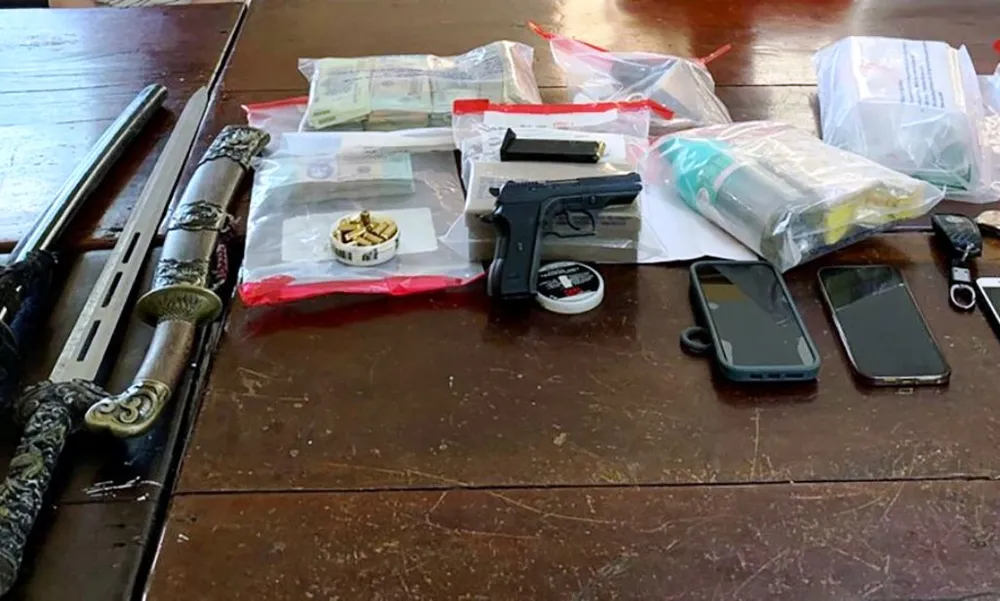 Công an còn phát hiện thu giữ một khẩu súng với 25 viên đạn, bảy cục dạng sừng (nghi là sừng tê giác) có khối lượng 711,915 g, hai ô tô hiệu Mercedes và Lexus 350.