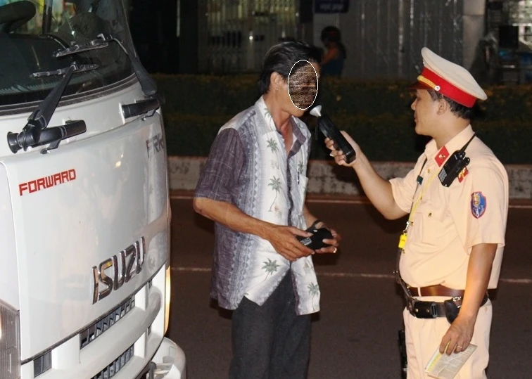 CSGT Công an TP Cần Thơ kiểm tra nồng độ cồn tài xế xe tải. Ảnh: GIA TUỆ