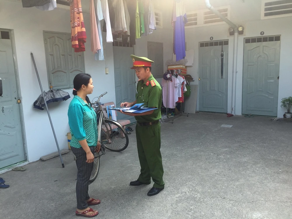 Công an phường Trường Thọ, quận Thủ Đức đi ra quân nhắc nhở từng chủ nhà trọ. Ảnh: ĐÀO TRANG.