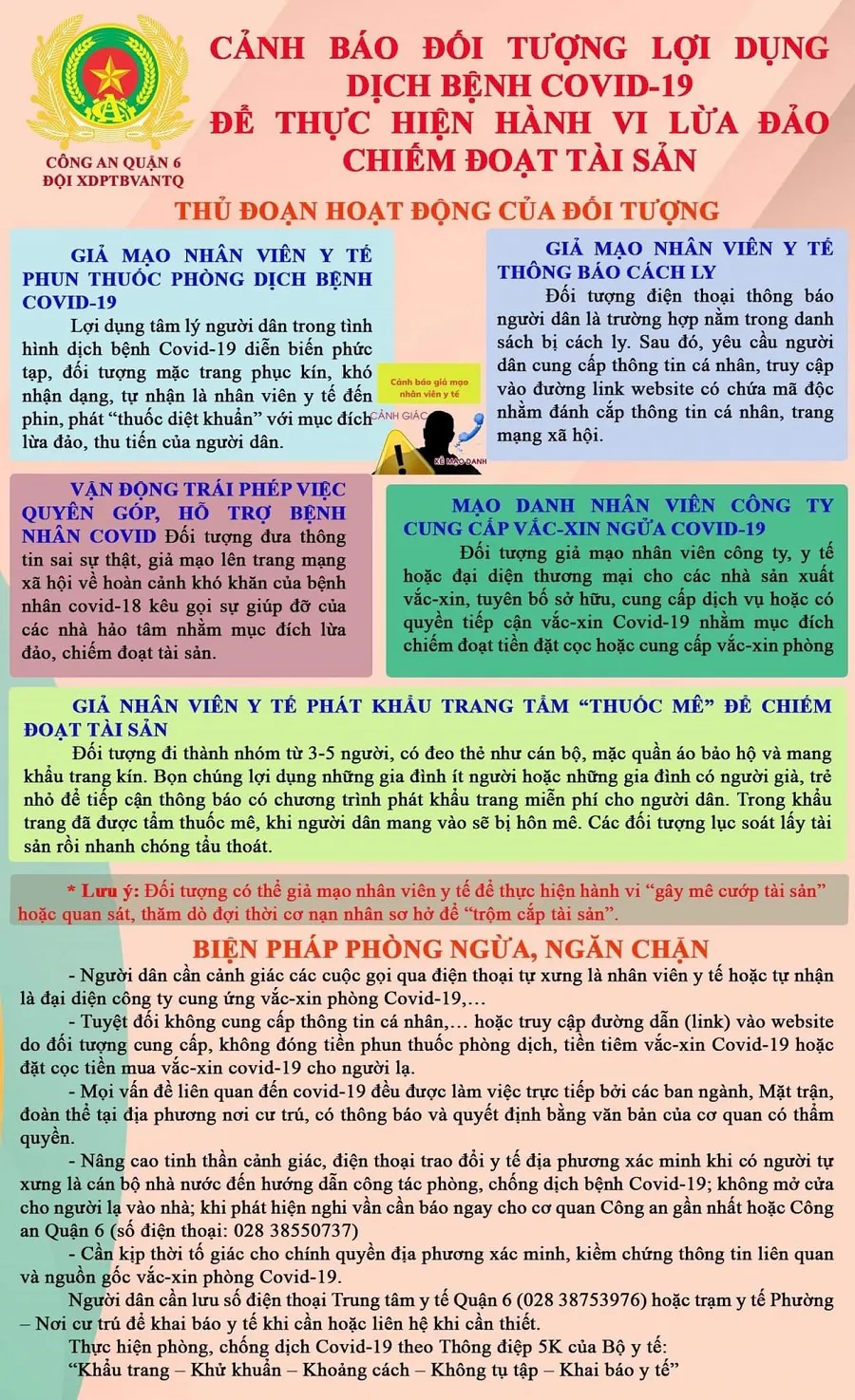 Công an quận 6 đưa ra thông báo cảnh giác những chiêu lừa liên quan đến dịch COVID-19 đến người dân.