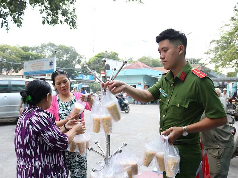 5 giờ 30, anh Trần Trí Hiệp (bảo vệ dân phố phường Tam Phú, quận Thủ Đức) chở cháo đến trước cổng BV. Còn Trung tá Nguyễn Văn Tài cùng các đồng nghiệp của mình thì lo sắp đặt bàn ghế và các dụng cụ để phát cháo từ thiện. 15 phút sau, từng gói cháo nóng hổi được treo sẵn trên chiếc kệ nhỏ, người bệnh nào muốn ăn chỉ việc đến lấy.