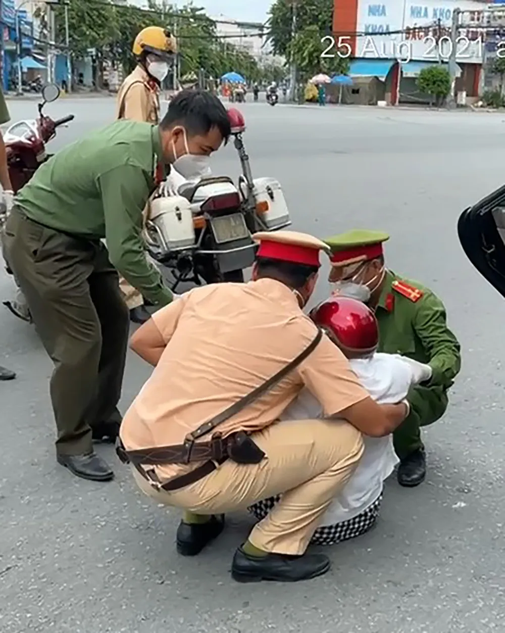 Các cán bộ chiến sĩ đã dìu chị Lệ đứng dậy, người phụ nữ cho biết có hiện tượng đau bụng, nghi chảy máu trong, chân tay trầy xước.