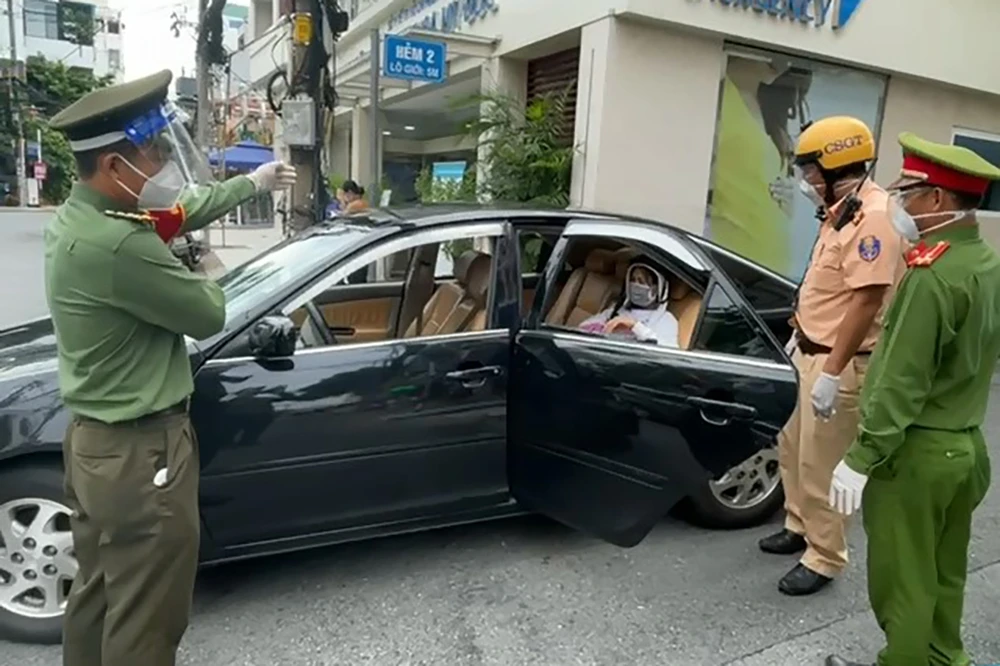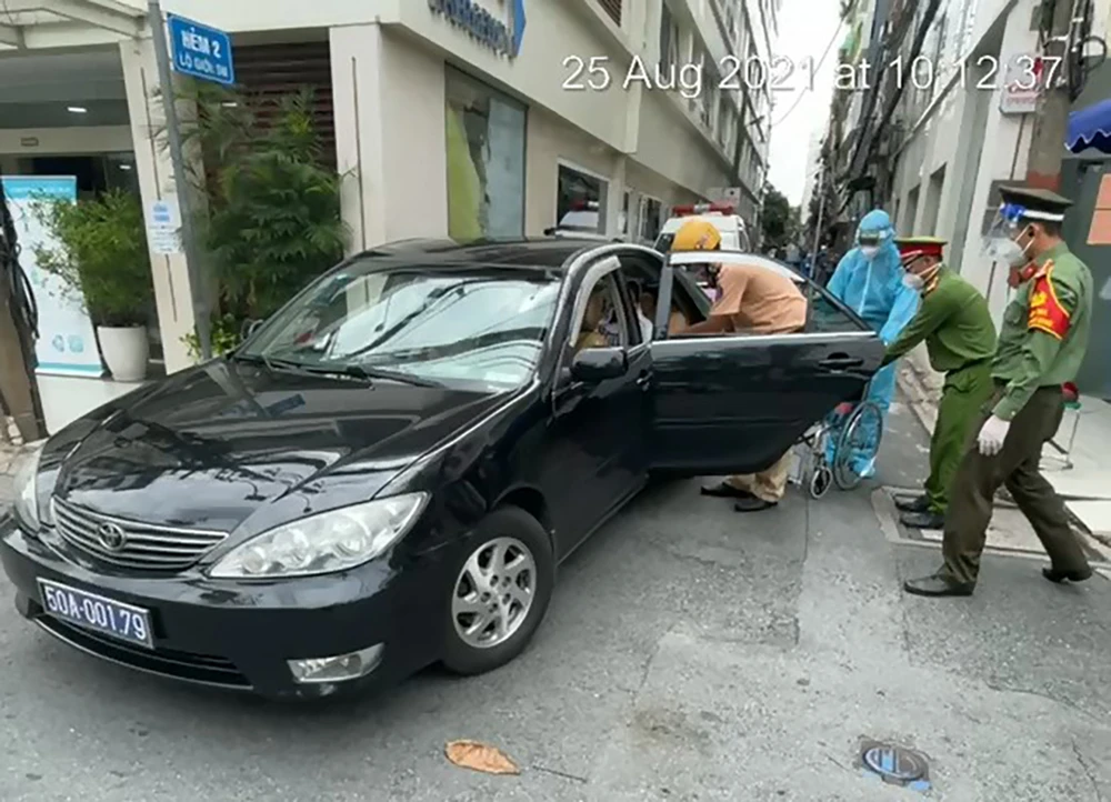Tổ kiểm tra điều lệnh đã phối hợp với tổ công tác đang trực chốt thuộc Công an quận 12 đưa chị Lệ lên xe công vụ.