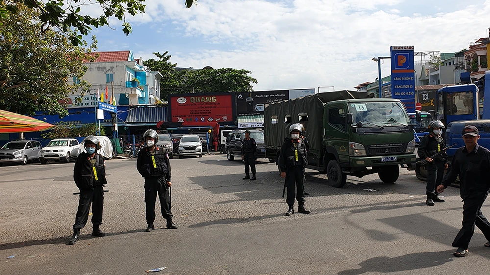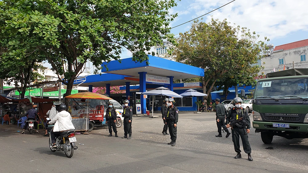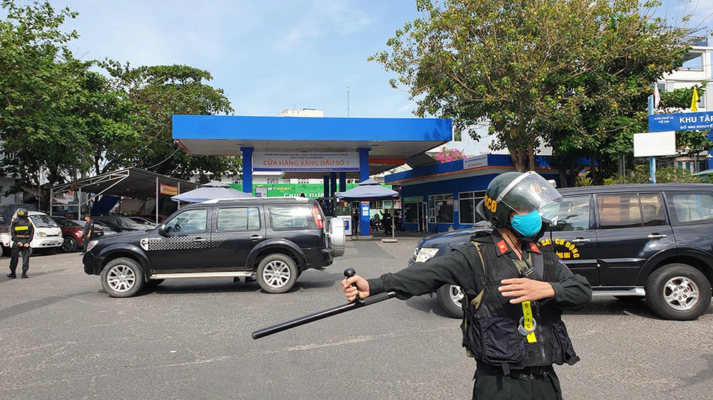 Theo ghi nhận, lực lượng Cảnh sát cơ động thuộc bộ công an với khoảng 11 cán bộ chiến sĩ trang bị súng, dụng cụ chuyên dụng túc trực ở vòng ngoài, hướng dẫn các phương tiện giao thông không vào cây xăng để đổ xăng hoặc người dân tụ tập lại gần.