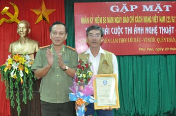 Đại tá Nguyễn Bá Nhiên (trái) trao giải cuộc thi ảnh nghệ thuật nhân ngày Báo chí Việt Nam. Ảnh: PYO