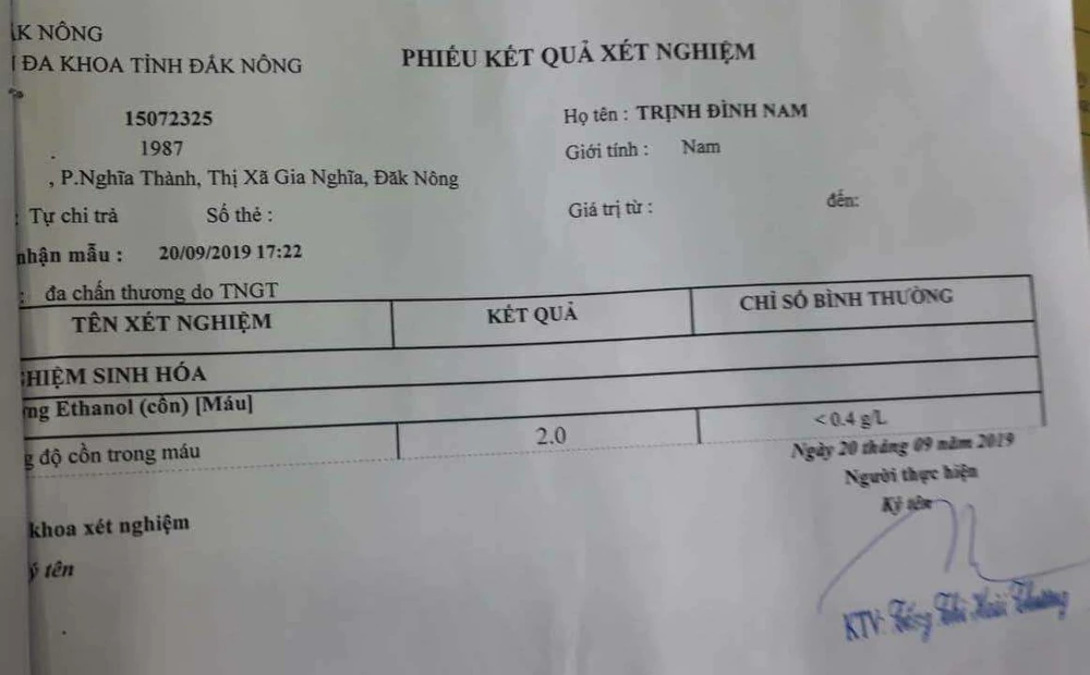 Theo kết quả kiểm tra nồng độ cồn trong máu của BV Đa khoa tỉnh Đắk Nông, vào thời điểm kiểm tra, ông Nam có nồng độ cồn trong máu 2.0g/L (chỉ số bình thường < 0,4g/L), vượt năm lần chỉ số quy định.