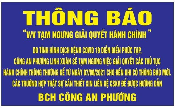 Tại Công an phường Linh Xuân, ban chỉ huy Công an phường đã ra thông báo: “Do dịch bệnh COVID-19 diễn biến phức tạp, Công an phường Linh Xuân sẽ tạm ngưng việc giải quyết các thủ tục hành chính thông thường từ ngày 7-6 cho đến khi có thông báo mới. Các trường hợp thật sự cần thiết xin liên hệ Công an khu vực để được hướng dẫn”.