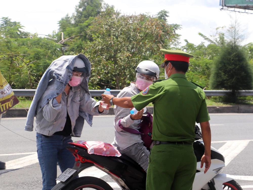 Bà con ở các tỉnh không có nhu cầu vào TP Cần Thơ được lực lượng chức năng hướng dẫn tiếp tục di chuyển và tặng bà con nước uống. Ảnh: CHÂU ANH