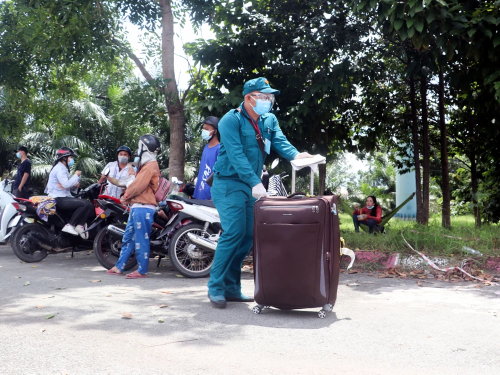 Lực lượng chức năng tại điểm kiểm soát giúp người dân vận chuyển hành lý đến nơi tập trung. Ảnh: CHÂU ANH
