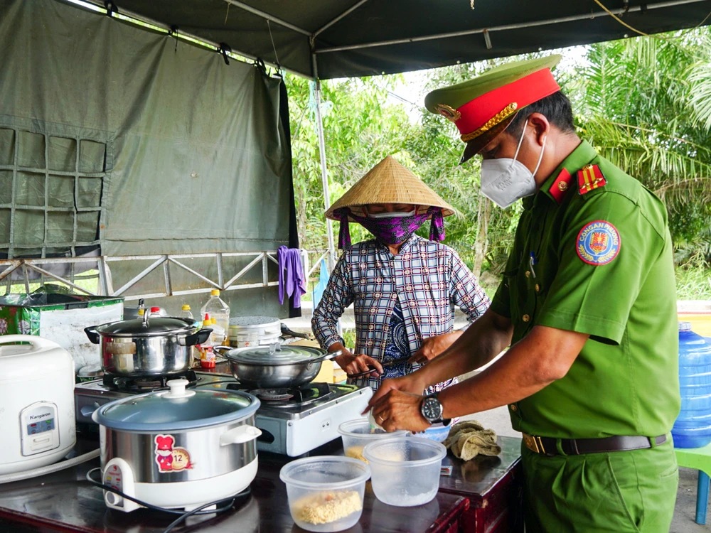 Chứng kiến cảnh bà con mệt mỏi sau một chặng đường dài, một chiến sĩ cảnh sát thuộc Công an quận Cái Răng thông báo với người dân: “Tại chốt chỉ có mì gói, ai có nhu cầu lên tiếng chúng tôi sẽ nấu cho bà con dùng tạm trong lúc chờ làm thủ tục”.