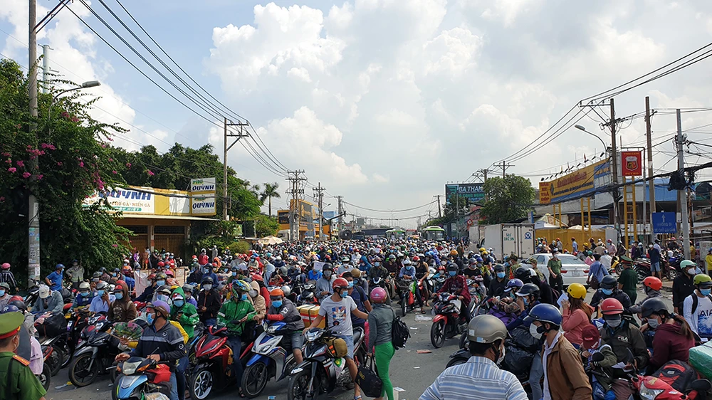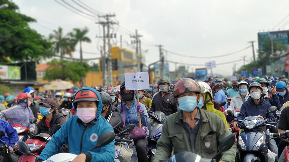 Đến địa phận TT Tân Túc, huyện Bình Chánh, TP.HCM, tất cả đều bị chặn lại tại các chốt kiểm soát. Hàng ngàn người vạ vật, nằm ngồi khắp nơi và chấp nhận nhịn đói để chờ đến sáng hôm sau. Họ đều là người mất việc làm đã ba đến bốn tháng nay do ảnh hưởng của dịch bệnh COVID-19.