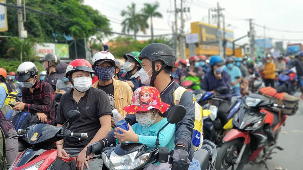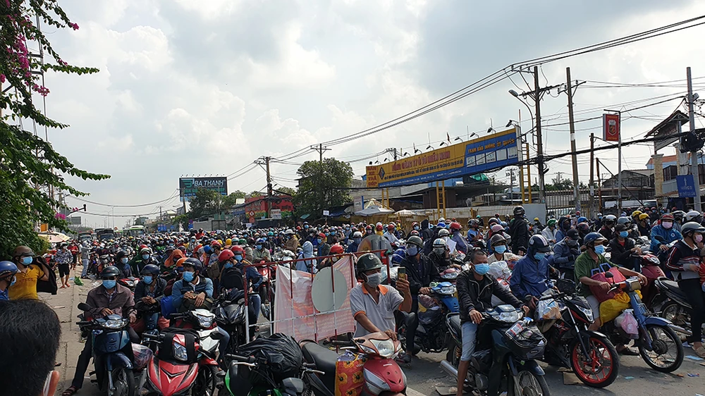 Trong lúc đó, đến trưa cùng ngày, cả ngàn người dân vẫn chờ đợi để được về quê đoạn qua TT Tân Túc, huyện Bình Chánh, TP.HCM. Ảnh NT