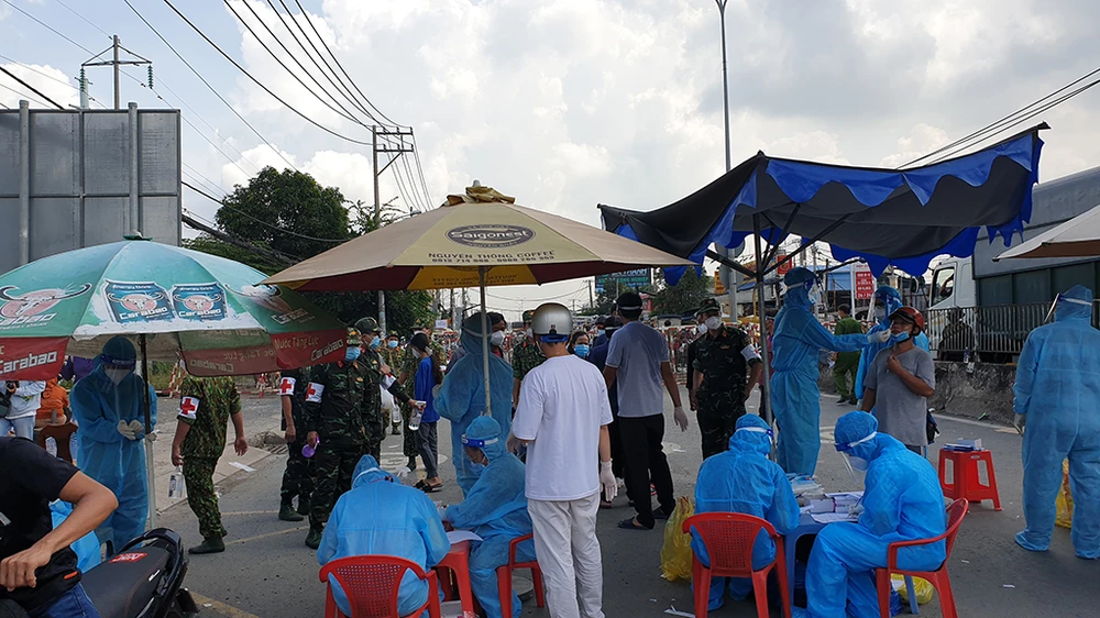 Từ khu vực giao lộ đường Nguyễn Đoàn Tuấn kéo dài hàng trăm mét hướng về Tỉnh Long An, nhiều lực lượng thuộc cả quân đội, công an chia thành từng tổ, có chặn cả hàng rào thép gai để hướng dẫn cho người dân sắp xếp trật tự, đảm bảo chống dịch.