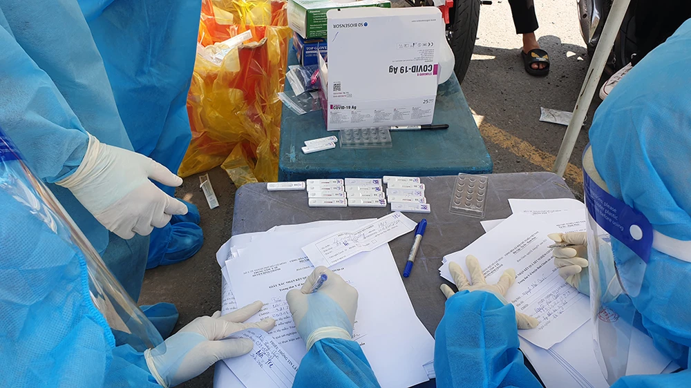 Lực lượng y tế test nhanh COVID-19 cho người dân. Ảnh NT