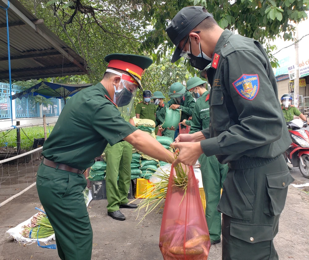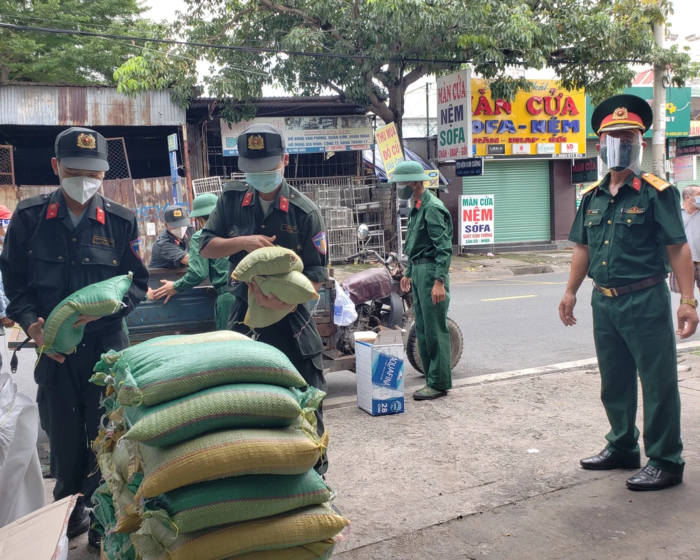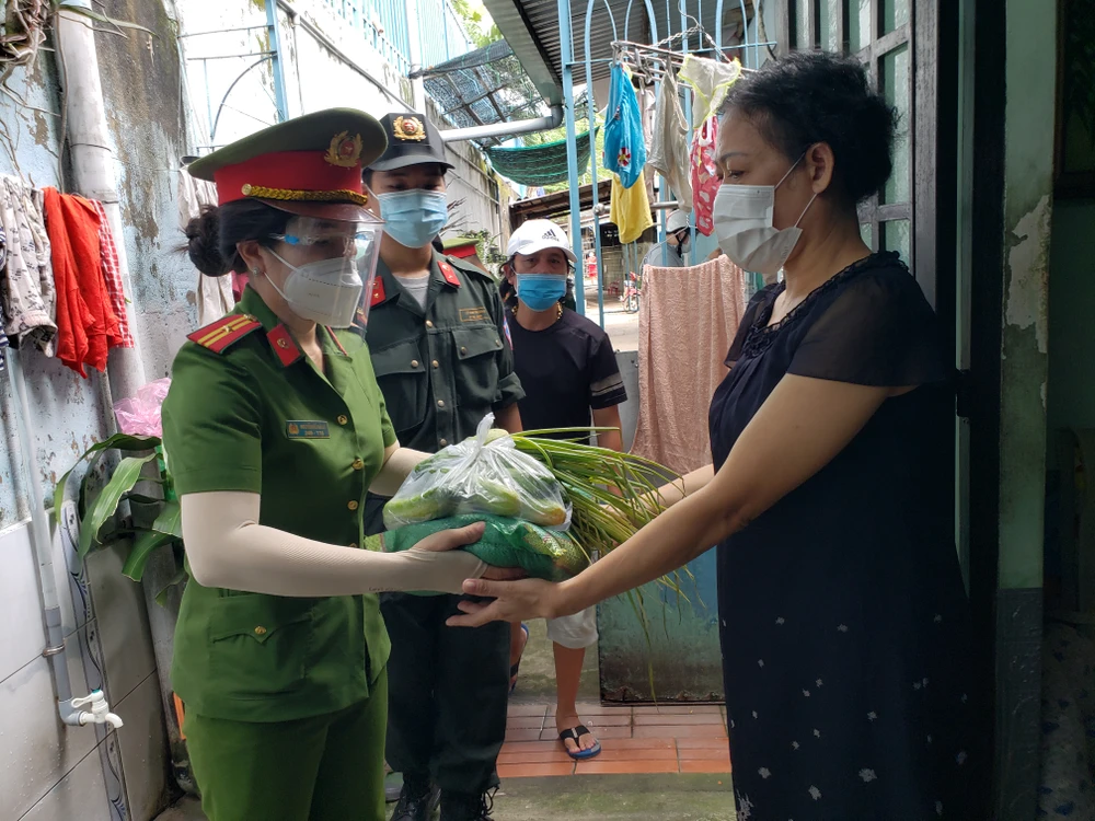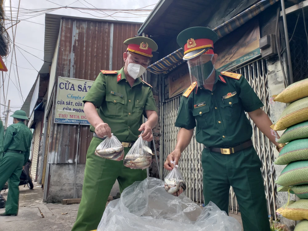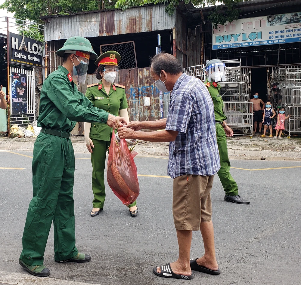 Sáng 23-8, ngày đầu siết chặt giãn cách xã hội, Công an phường Tam Bình (TP Thủ Đức, TP.HCM) đã phối hợp cùng lực lượng Sư đoàn 5, Quân khu 7; Bộ Tư lệnh Cảnh sát Cơ động (Bộ Công an) phát miễn phí hơn 500 phần thực phẩm thiết yếu cho người dân.
