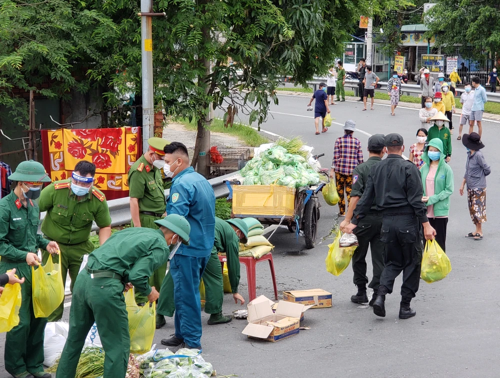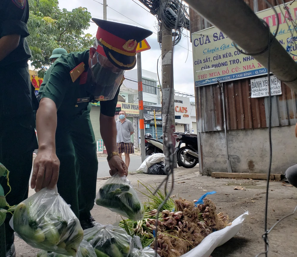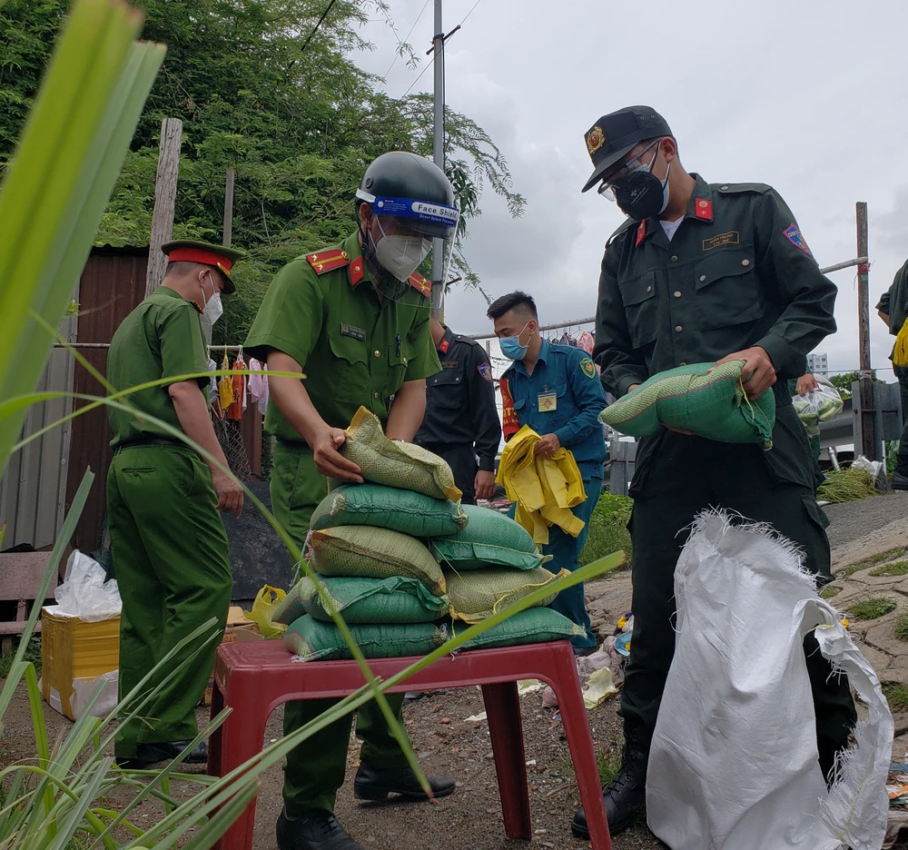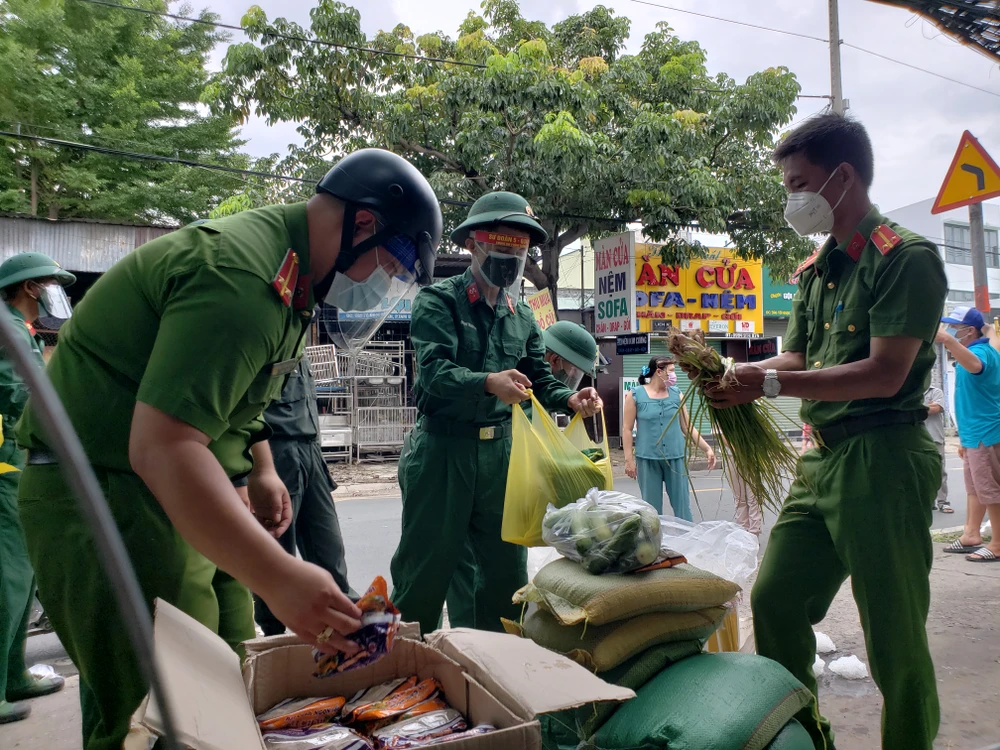 Tại khu vực tập kết, Trung tá Phạm Đăng Khải (Phó trưởng Công an phường Tam Bình), Thiếu tá Nguyễn Văn Việt (Tiểu đoàn 17, Sư đoàn 5, QK7) cùng hàng chục cán bộ chiến sĩ, Bộ tư lệnh Cảnh sát cơ động tất bật phân loại và chuyển thực phẩm đến tận tay người dân.