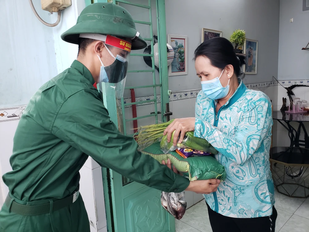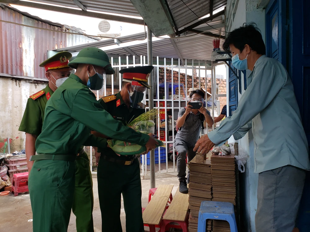 Lực lượng Sư đoàn 5, Quân khu 7 đi đến tận nhà trọ trao thực phẩm thiết yếu cho người dân. Ảnh: TS