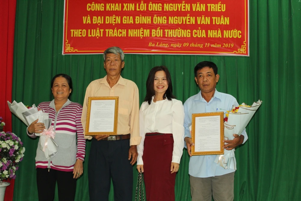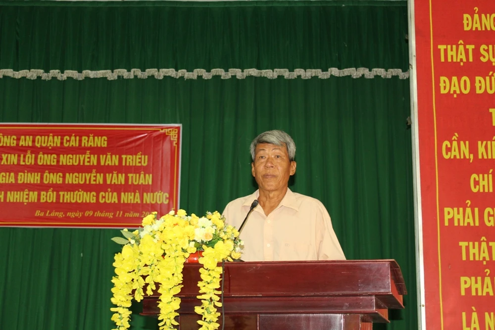 Sáng 9-11, tại UBND phường Ba Láng (quận Cái Răng, TP Cần Thơ), Công an quận Cái Răng đã tiến hành các thủ tục xin lỗi công khai tại nơi cư trú đối với ông Nguyễn Văn Triều (60 tuổi, ngụ phường Ba Láng) và đại diện gia đình ông Nguyễn Văn Tuân theo Luật Trách nhiệm bồi thường của Nhà nước.