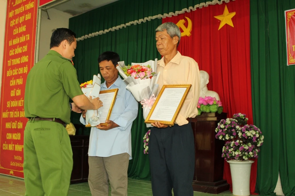 Đại diện Công an quận Cái Răng trao hoa và quyết định bồi thường oan cho ông Triều và đại diện gia đình ông Tuân. Ảnh: NN
