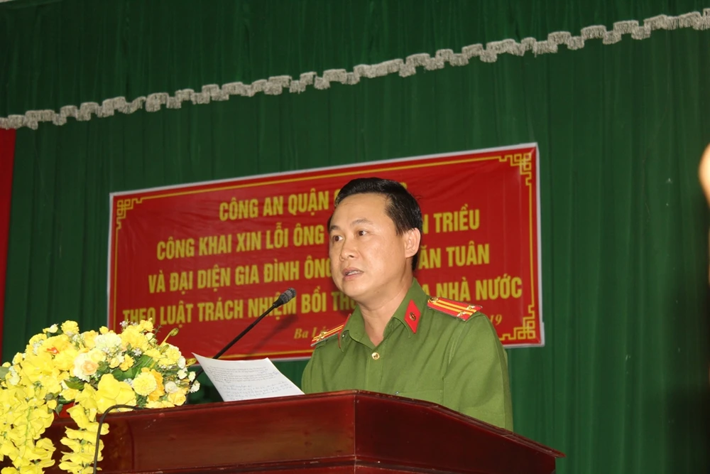 Trung tá Võ Tấn Ngọc - Phó Trưởng Công an quận Cái Răng đọc lời công khai xin lỗi ông Triều và đại diện gia đình ông Tuân tại buổi xin lỗi. Ảnh: NN