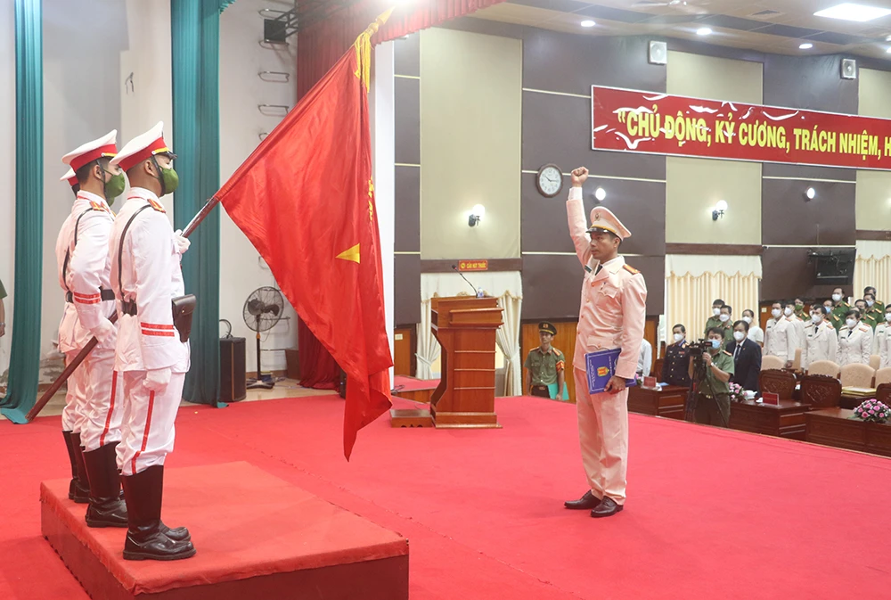 Trung tá Nguyễn Ngọc Thạnh tuyên thệ nhận chức Trưởng phòng An ninh mạng và phòng, chống tội phạm sử dụng công nghệ cao công an tỉnh Quảng Ngãi. Ảnh: T.QUÂN