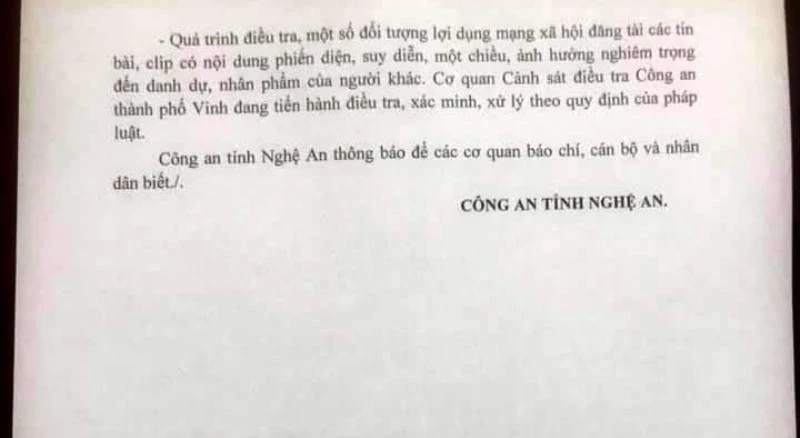Công an tỉnh Nghệ An cũng cho biết: ‘‘Quá trình điều tra, một số đối tượng lợi dụng mạng xã hội đăng tải các tin bài, clip có nội dung suy diễn, một chiều, ảnh hưởng nghiêm trọng đến danh dự, nhân phẩm người khác. CQĐT Công an TP Vinh đang tiến hành điều tra xác minh, xử lý theo quy định của pháp luật’’.