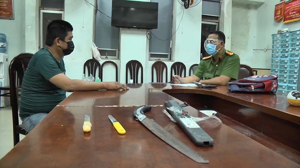 Thịnh cùng tang vật là hung khí tại cơ quan điều tra. Ảnh: HT
