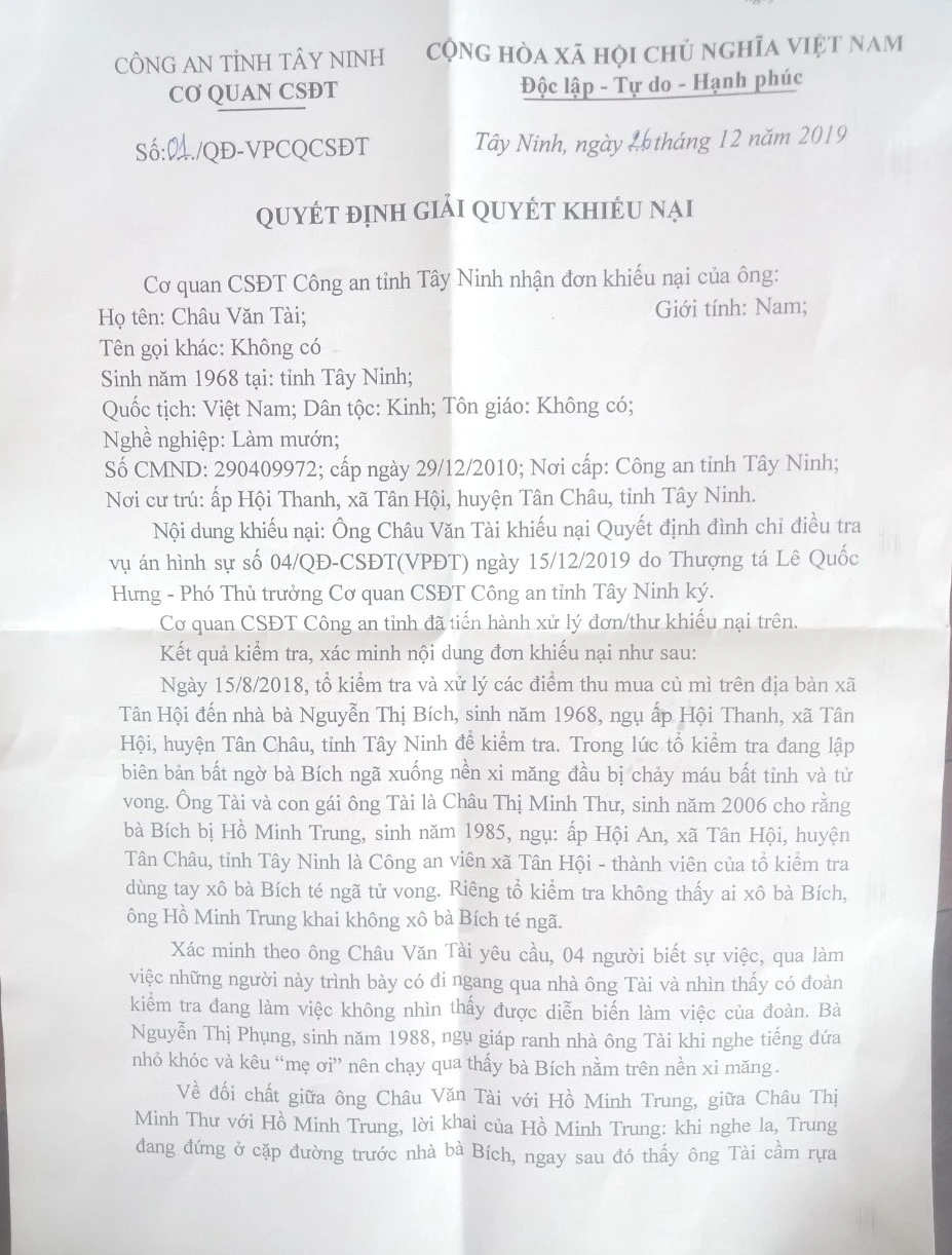 Mới đây, gia đình bà Nguyễn Thị Bích (SN 1968, ngụ xã Tân Hội, huyện Tân Châu, Tây Ninh) đã nhận được quyết định giải quyết khiếu nại của công an tỉnh Tây Ninh.
