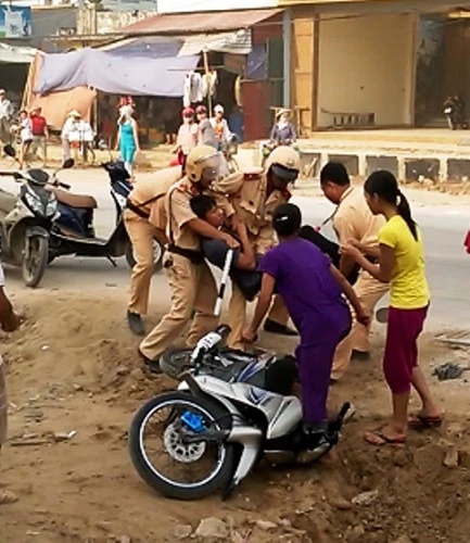 Ngay lập tức tổ công tác dùng biện pháp cưỡng chế đưa xe lên ôtô và yêu cầu người thanh niên về trụ sở Công an xã Hải Ninh để giải quyết. Tuy nhiên người vi phạm đã chống đối quyết liệt bằng cách cởi áo, nhảy lên thùng xe vừa chửi bới vừa giằng co, ngăn cản không cho lực lượng Cảnh sát giao thông mang xe về trụ sở xã Hải Ninh.