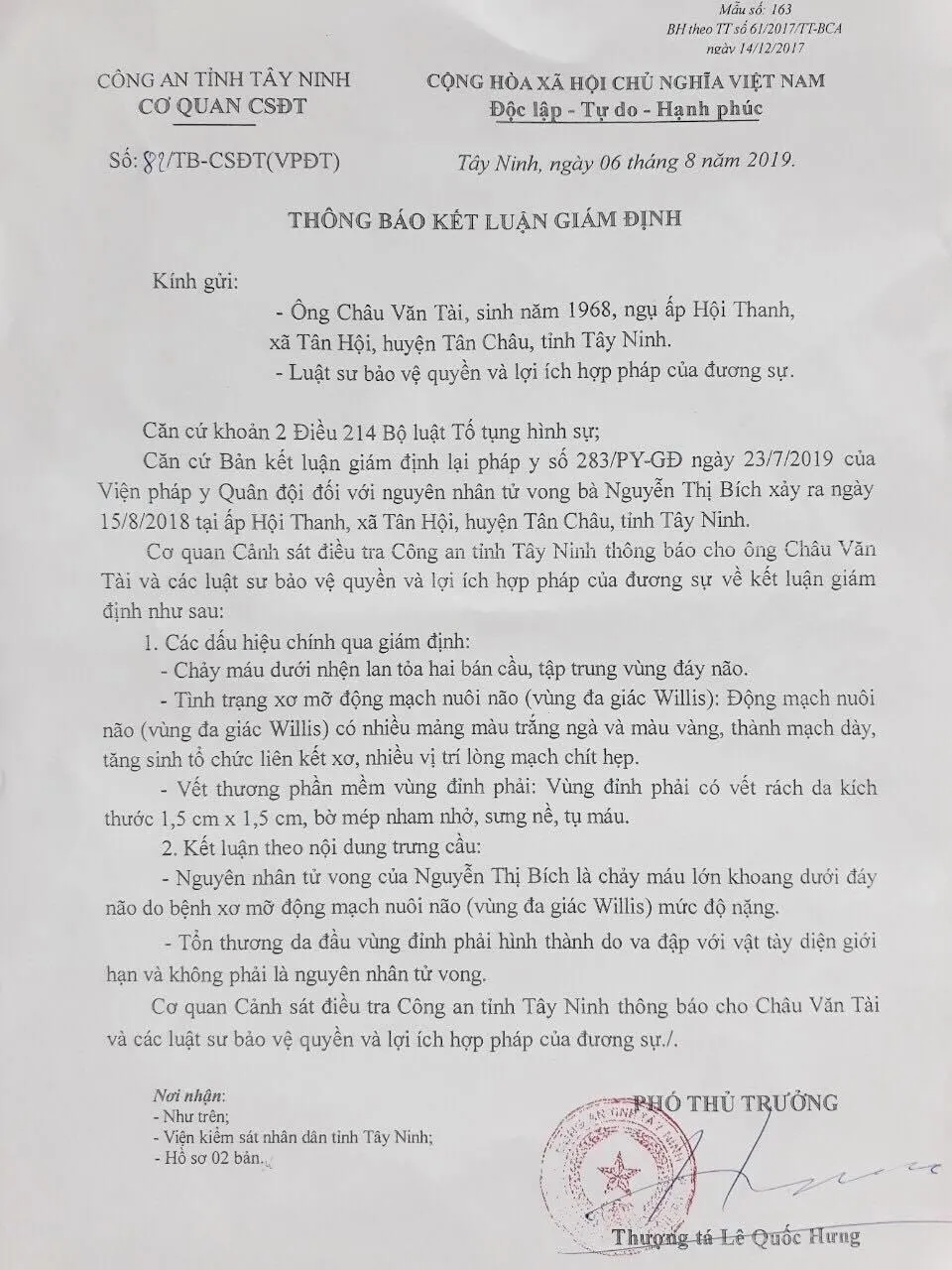 Công an tỉnh Tây Ninh vừa có thông báo kết luận giám định lần hai gửi đến gia đình nạn nhân Nguyễn Thị Bích (SN 1968, ngụ ấp Hội Thanh, xã Tân Hội, huyện Tân Châu, Tây Ninh) và luật sư bảo vệ quyền và lợi ích của đương sự.
