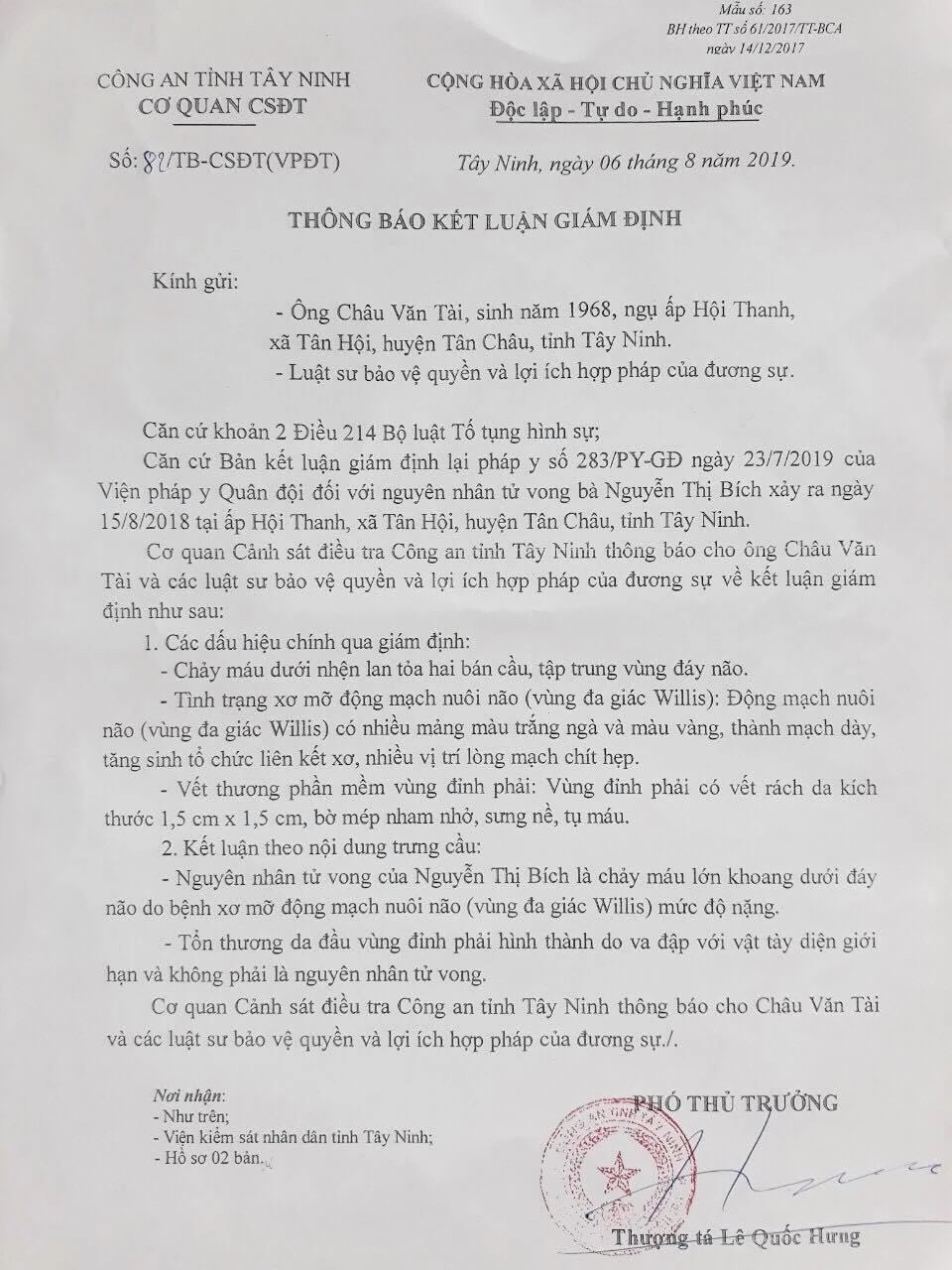 Thông báo kết quả giám định của Công an tỉnh Tây Ninh.