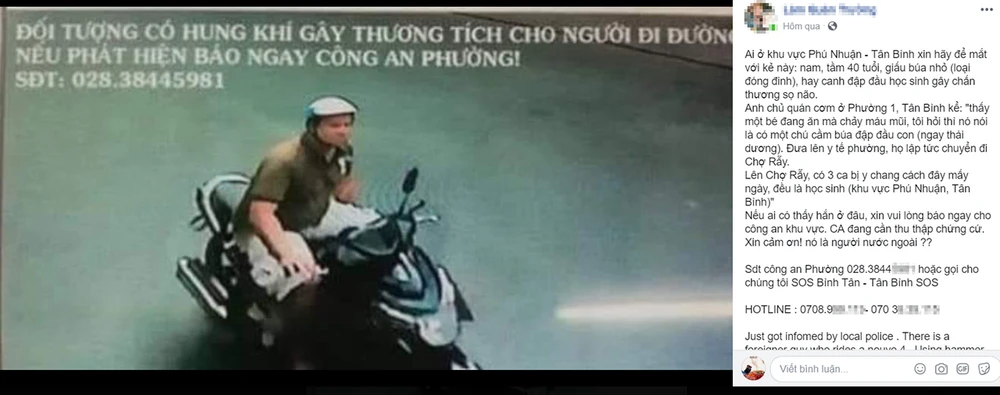 Từ ngày 16-2, trên mạng xã hội lan truyền và chia sẻ chóng mặt thông tin một người nước ngoài đi xe Nouvo dùng búa đóng đinh tấn công các học sinh gây chấn thương sọ não tại khu vực quận Phú Nhuận và Tân Bình (TP.HCM).