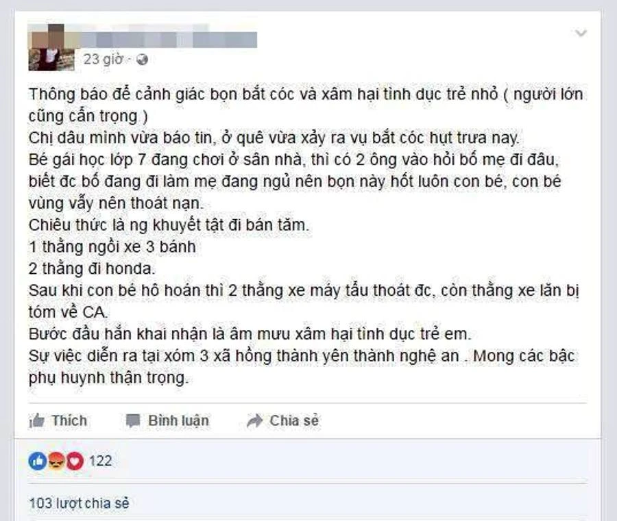 Trước đó, ngày 13-3, chị NgHTh (giới thiệu là đang học quản lý văn hóa, nghệ thuật, Trường ĐH Văn hóa TP.HCM) lên Facebook viết "thông báo để cảnh giác bọn bắt cóc và xâm hại tình dục trẻ nhỏ (người lớn cũng cẩn trọng)".