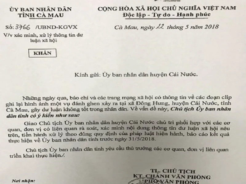 Công văn chỉ đạo khẩn của chủ tịch tỉnh Cà Mau về vụ đánh ghen.