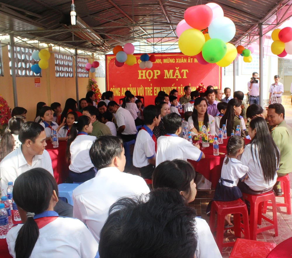 Tại đây, Đại tá Nguyễn Hải Sơn – Bí thư Đảng ủy, Giám đốc Công an tỉnh Hậu Giang cùng lãnh đạo công an tỉnh đã trao 41 phần quà cho trẻ em khuyết tật cùng 24 phần quà tết cho đội ngũ thầy cô giáo nhân viên của trường dạy trẻ em khuyết tật, đồng thời tặng nhà trường 10 triệu đồng để tổ chức tết cho các em.