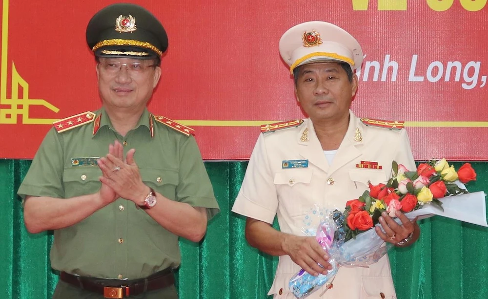 Thượng tướng Nguyễn Văn Thành, Thứ trưởng Bộ Công an trao hoa chúc mừng tân giám đốc Công an tỉnh Vĩnh Long
