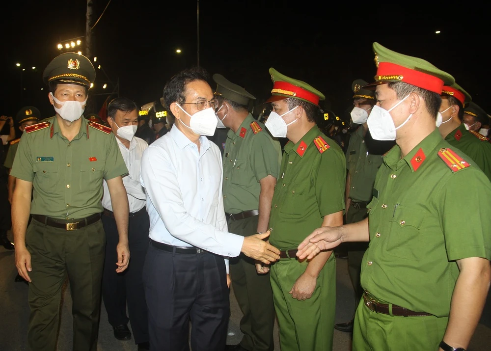 Thiếu tướng Vũ Hồng Văn, Giám đốc Công an tỉnh và Bí thư Thành ủy Biên Hòa Võ Văn Chánh động viên các cán bộ chiến sĩ trước giờ xuất quân. Ảnh: VŨ HỘI