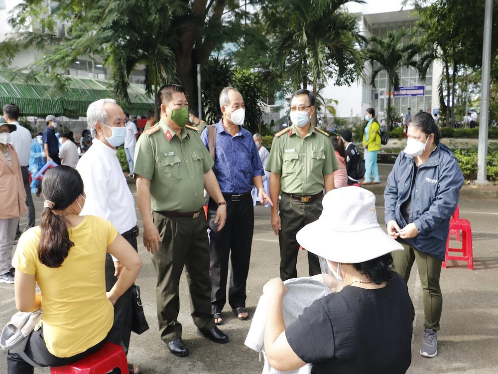 Đại tá Lương Văn Bền, Phó Giám đốc Công an thành phố thăm hỏi các chức sắc, chức việc, người có uy tín trong các tôn giáo tại điểm tiêm> Ảnh: HD