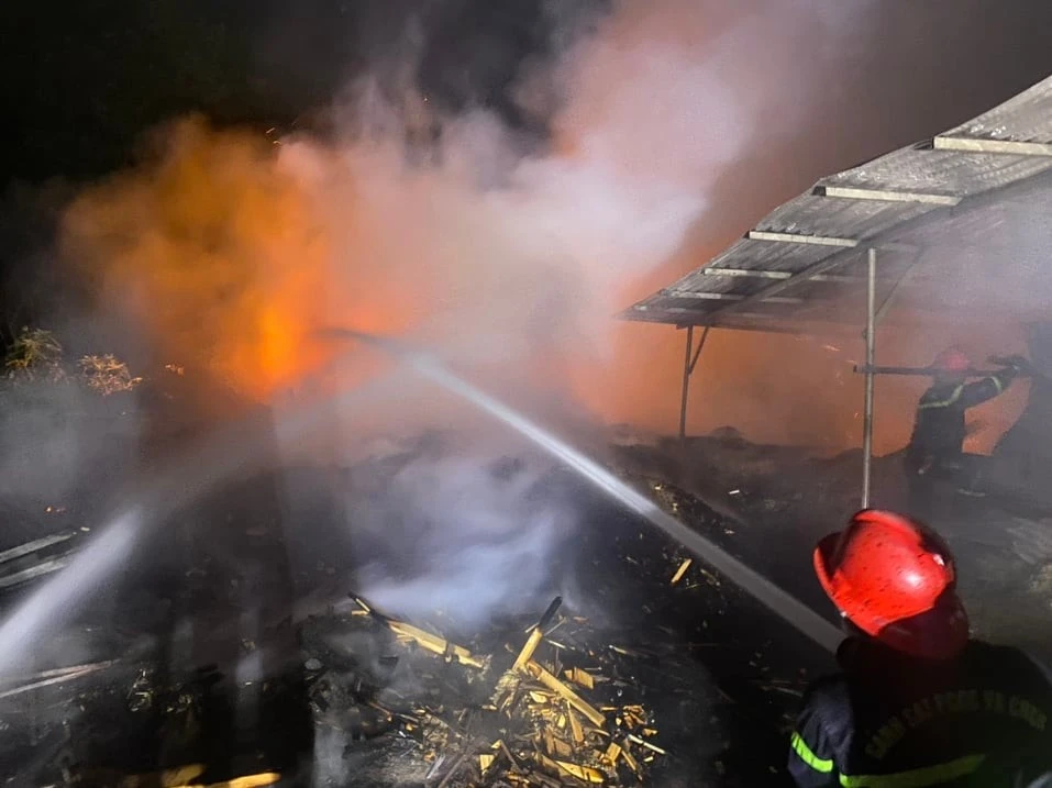 Ngọn lửa cũng thiêu rụi 200 m2 nhà xưởng gỗ xuất khẩu của Công ty TNHH SX TM DV Sơn Lâm tại phường Linh Trung. Ảnh: TS