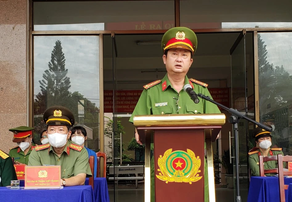 Đại tá Nguyễn Hoàng Thắng, Trưởng Công an TP Thủ Đức phát biểu chỉ đạo lễ ra quân. Ảnh: TS