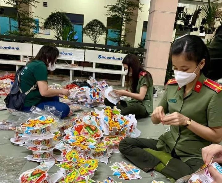 Công an TP Thủ Đức cho biết, để có được đèn Trung thu truyền thống các cán bộ chiến sĩ công an đã tự tay chất chiu từng cuộn giấy, miếng dán làm nên những lồng đèn thân thiện, gần gũi với các em thiếu nhi.